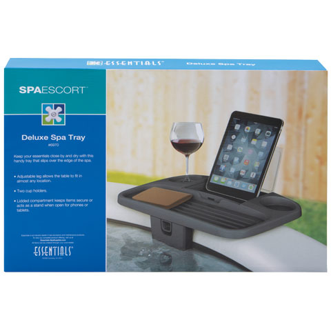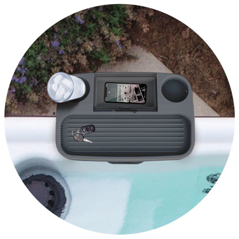 Secure and versatile tray table with two cup holders, anti-slip (grooved) shelf and special waterproof section to stow items liek cell phones. Open up the lid and use for a book or tablet stand. Fits most spa and hot tub walls.