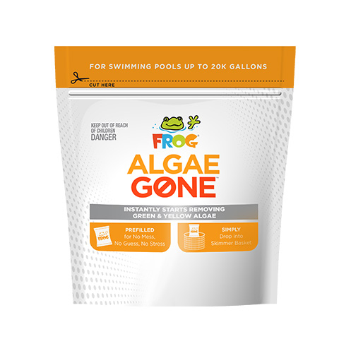 Algae? Not with FROG® Algae Gone – it kills yellow and green algae. This unique dry, concentrated copper based formula is designed to kill algae with ease, plus treat and cure algae outbreaks. Use it, and get your pool sparkling clear. Unlike traditional products, Algae Gone comes in a convenient, prefilled pod that makes application a breeze. Just Drop ‘n Go™ in your pool skimmer. No measuring, no mess — just crystal clear water. No more algae worries!